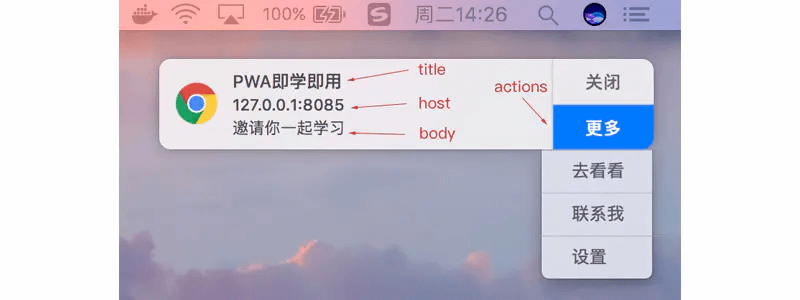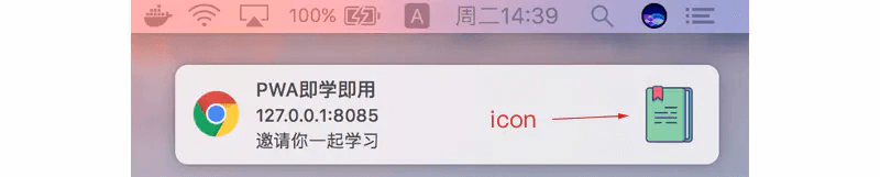 1 2 3 4 5 6 7 8 9 10 11 12 13 14 15 16 17 18 19 20 21 22 23 24 …… document .querySelector('#js-notification-btn' ).addEventListener('click' , function ( ) { var title = 'PWA即学即用' ; var options = { body: '邀请你一起学习' , icon: '/img/icons/book-128.png' , actions: [{ action: 'show-book' , title: '去看看' }, { action: 'contact-me' , title: '联系我' }], tag: 'pwa-starter' , renotify: true }; var notification = new Notification(title, options); }); ……