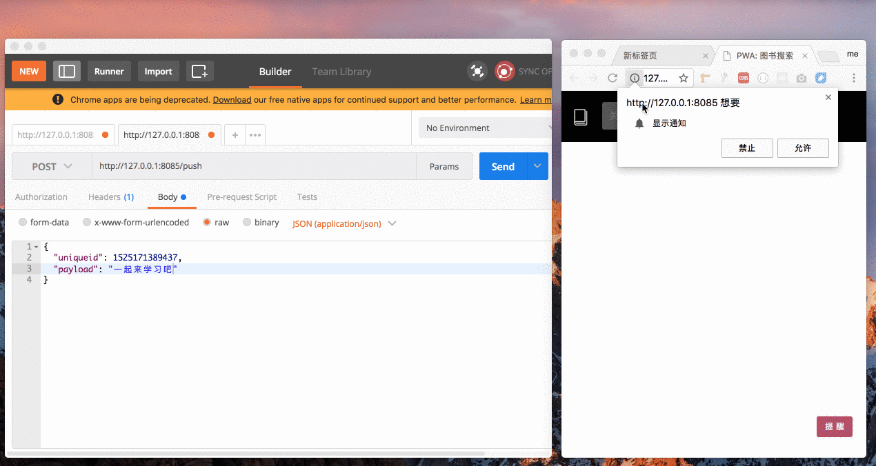 本文会先介绍如何使用 Notification API。然后,作为 Notification 的“黄金搭档”,本文还会介绍如何组合使用 Push & Notification(消息推送与提醒)。文中的代码可以在learning-pwa的notification分支 上找到(git clone