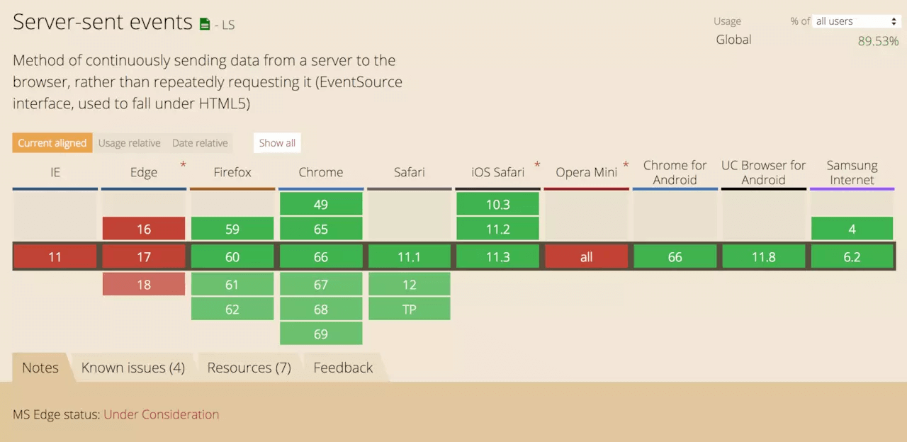 此外,我们还可以考虑结合HTTP/2的优势来使用SSE。然而,一个可能不太好的消息是,IE/Edge并不兼容。