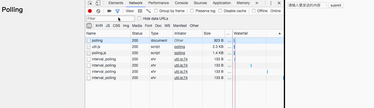 轮询开始时,向后端发送请求,待响应结束后,间隔一定时间再去请求数据,如此循环往复。效果如下: