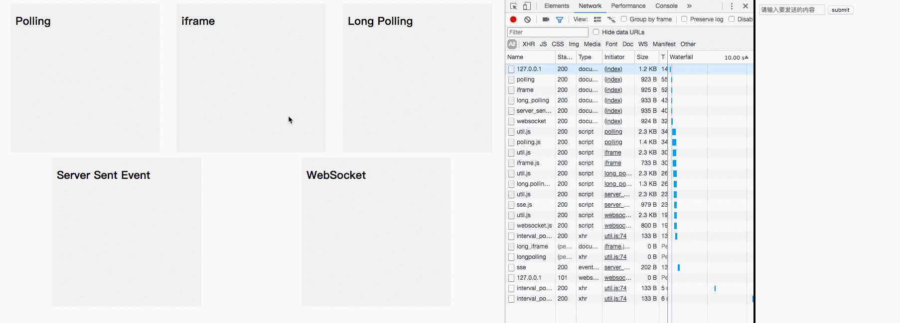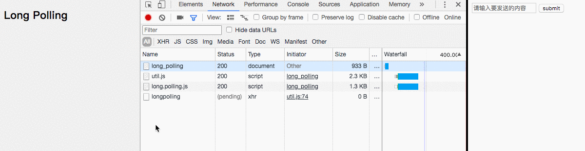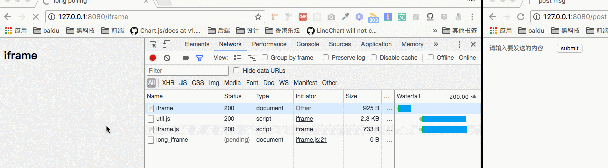 当我们在页面中嵌入一个iframe并设置其src时,服务端就可以通过长连接“源源不断”地向客户端输出内容。