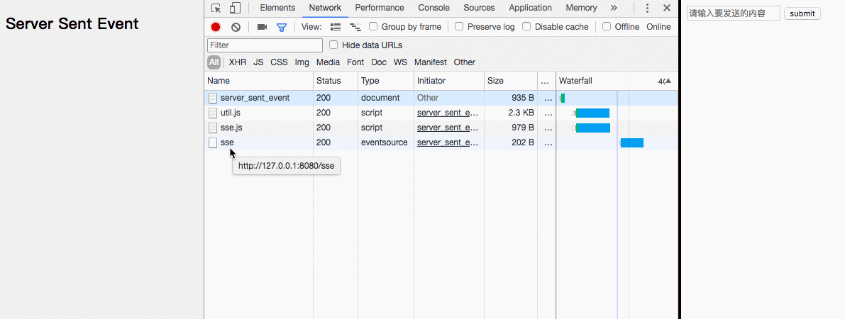 SSE规范比较简单,主要分为两个部分:浏览器中的EventSource