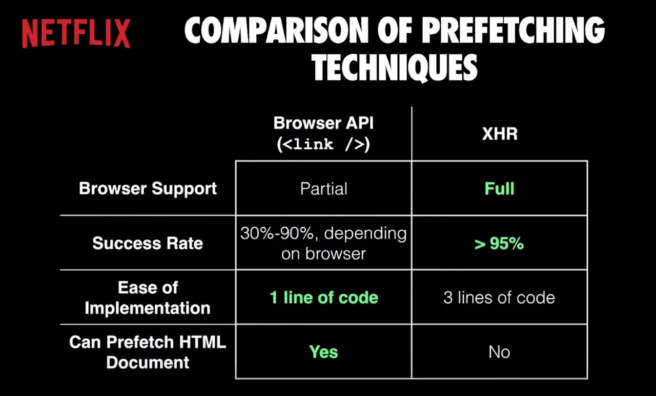 值得一提的是,使用 Resource Hints 与使用 XHR 来预加载资源还是有一些重要差异的。草案中也提到了一些(主要是性能差异以及与浏览器其他行为之间的冲突)。其中还有一点就是,Resource Hints 中的 prefetch 是否执行,完全是由浏览器决定的,草案里有句话非常明显 —— the user agent SHOULD fetch。因此,所有 prefetch 的资源并不一定会真正被 prefetch。相较之下,XHR 的方式“成功率”则更高。这点在 Netflix 实施的性能优化案例中也提到了。